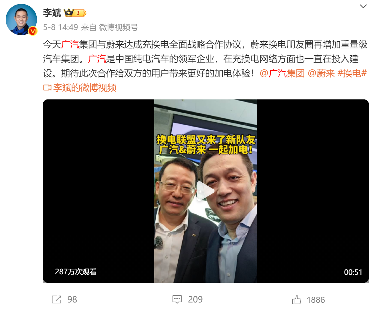 2023年11月21日,长安汽车宣布与蔚来达成合作,双方将联合研发换电车型、换电技术、统一标准,成为了首家加入蔚来换电阵营的车企。随后,吉利、江淮、奇瑞、路特斯四家车企也加入了蔚来换电阵营。本月上旬,广汽集团与蔚来在广州签订合作协议,成为了第六家加入蔚来换电阵营的车企。