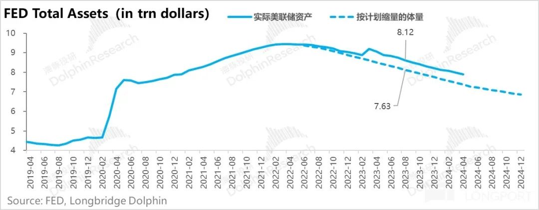 而且在逆回购一定余额空间(目前 8500 亿美金,对应疫情前平均 2000-3000 亿美金)的情况下,6 月开始放缓,而且直接就砍掉了 350 亿的削减额度,这个力度是超出了海豚君的预判的。