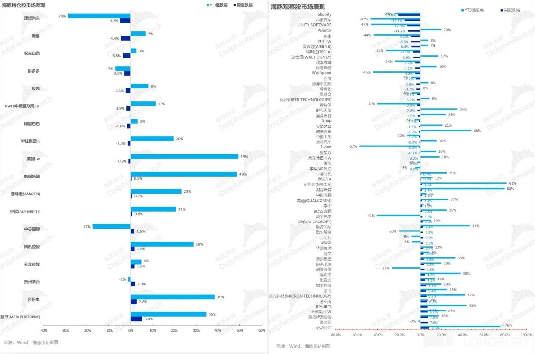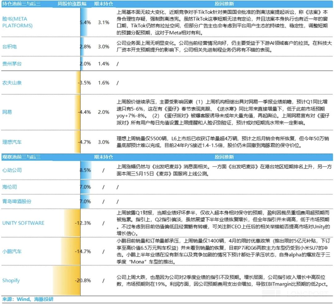 对于海豚君持仓池和关注池中,上周主要涨、跌幅比较大的公司以及可能原因,海豚君分析如下: