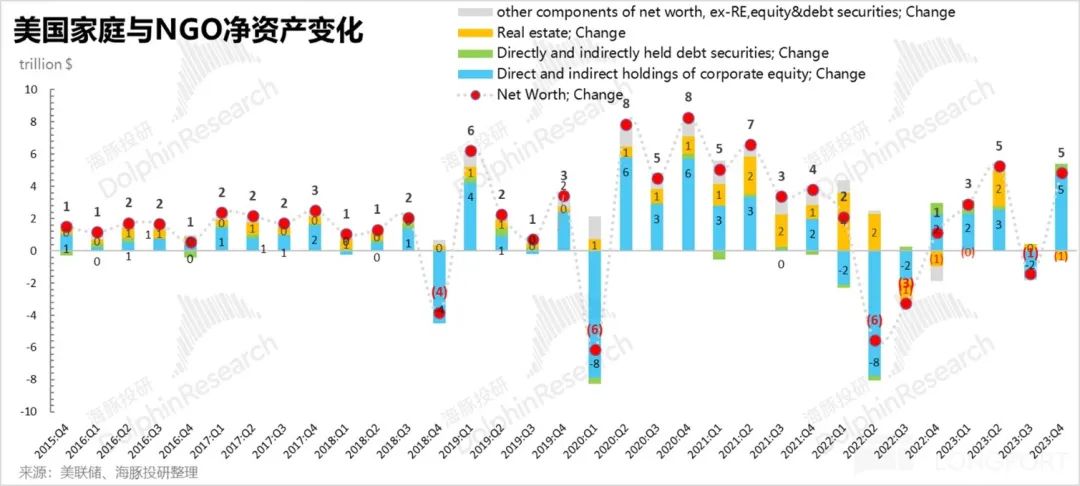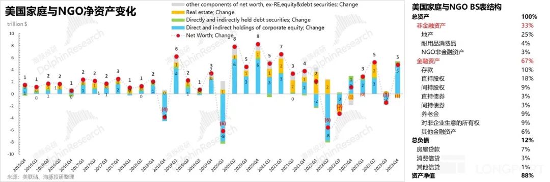 第一:美国居民财富中,金融财富占比较高,其中最终穿透为股权和债权的金融资产占比为 43%,超过了房产。因此股债波动对居民财富效应影响较大。