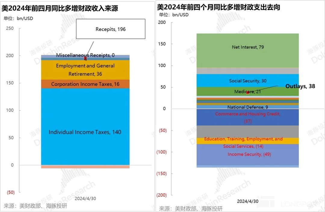 而 4 月由于是税收季,最新的 4 月财政数据表现就更好了:由于从居民部门征收到的个税收入较高,美国联邦 4 月是 2100 亿美金的财政顺差,剔除利息支出,顺差接近 3000 亿美金。