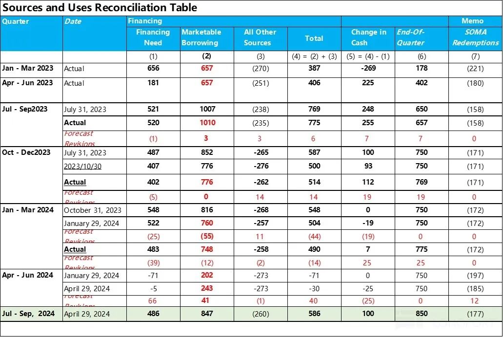 但即使这样,美国财政部在发布 7-9 月季的融资规划的时候,还是超出了市场原本预期的体量。下一个季度里,在假设美联储还是每个月抛售 600 亿国债的情况下,财政部计划向市场借债接近 8500 亿美金,同时把 TGA 账户的目标余额从之前的 7500 提高到 8500 亿美金。