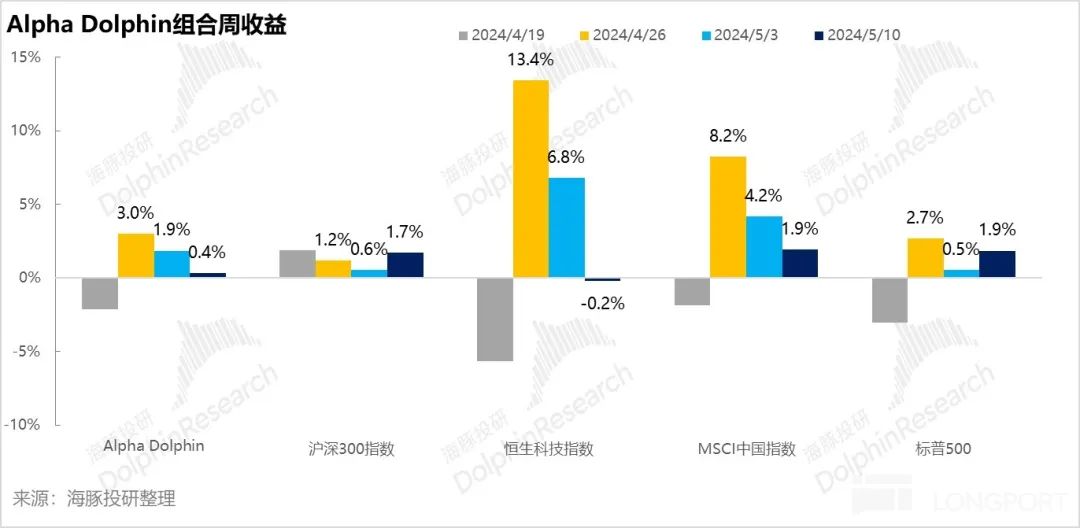 上周结束,组合收益上涨 0.4%,跑输了沪深 300(+1.7%)和 MSCI 中国(+1.9%)和标普 500(+1.9%),稍强于恒生科技(-0.2%)。