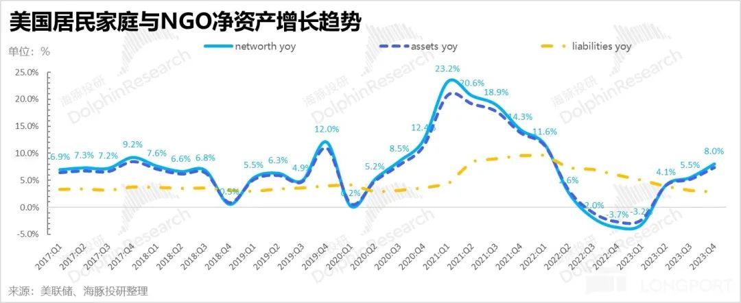从当前的美国居民的资产负债表情况来看,确实是总资产因金融资产膨胀而持续升值,其中资产端流动性资产存款则因为疫情中的超额储蓄和疫情后就业较好,储蓄相对于负债的支付能力非常强,不需要存额外现金来准备还款。