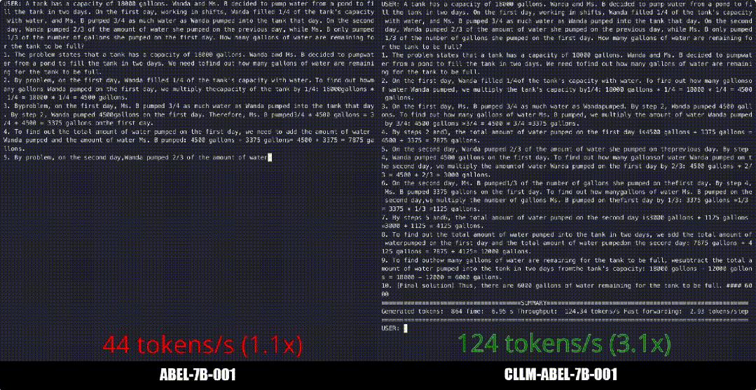 实验结果也比较理想,CLLM方法确实可以在接近目标模型生成效果的同时,大幅加快生成速度,从原有的约40 token/s提升至超过120 token/s。