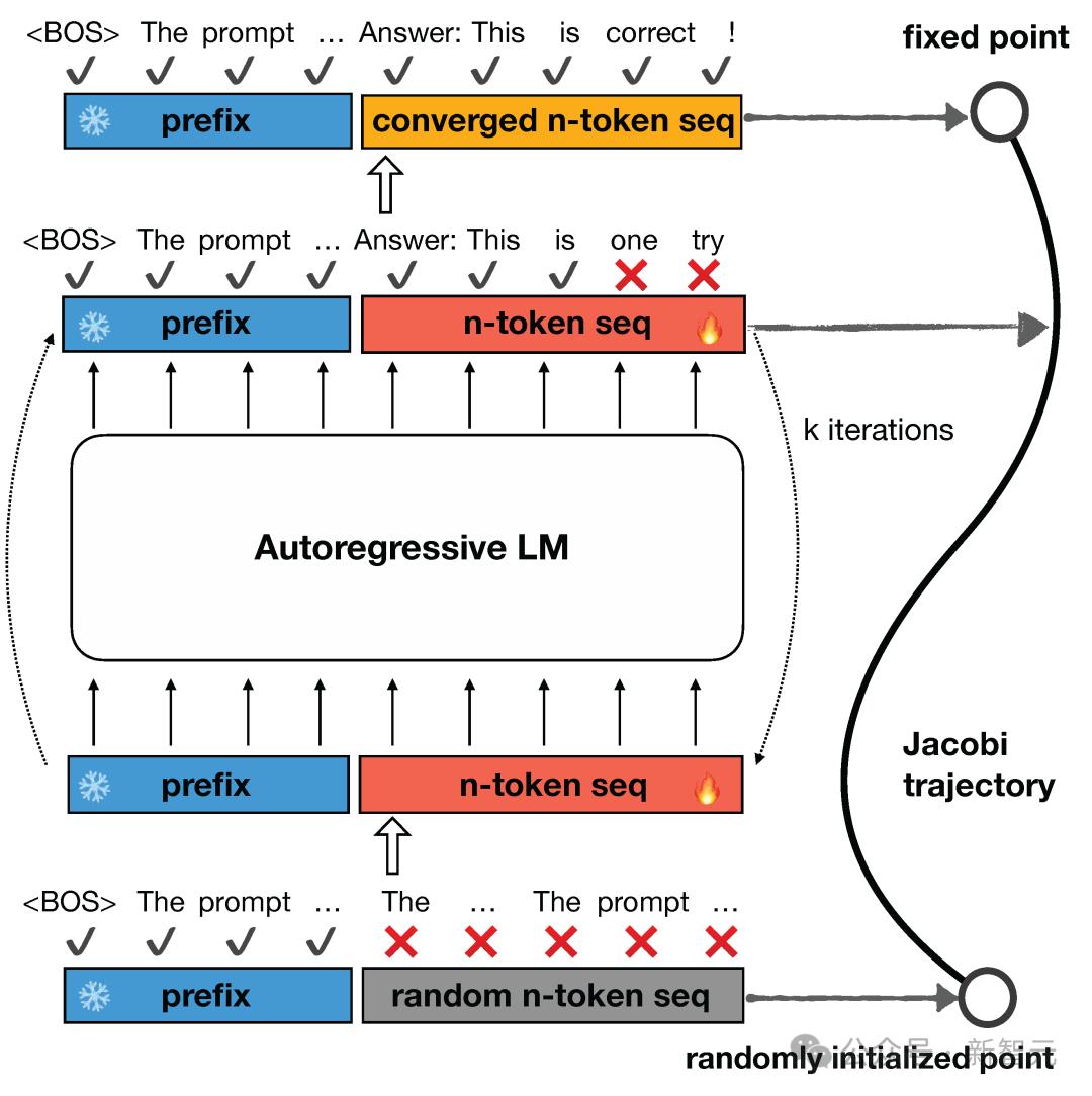 给定一个初始序列时,首先生成n个随机token作为起始点,之后将这n个token的优化问题看作n个非线性方程组,里面含有的n个变量可以基于Jacobi迭代并行求解。