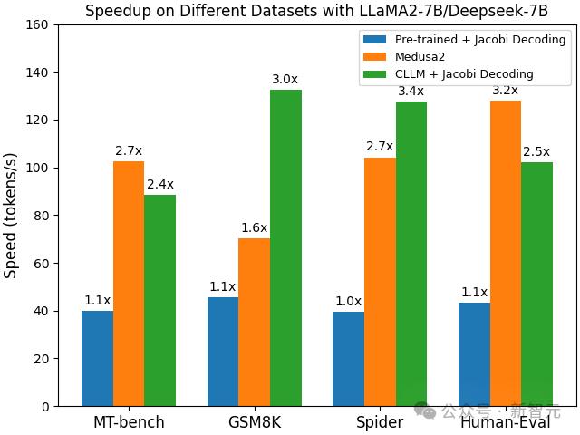 CLLM在多个下游任务上都取得了2-3倍的加速,且推理过程没有引入额外成本。在GSM8K和Spider两个任务中,相比今年1月刚发布的Medusa 2都有了明显提升。