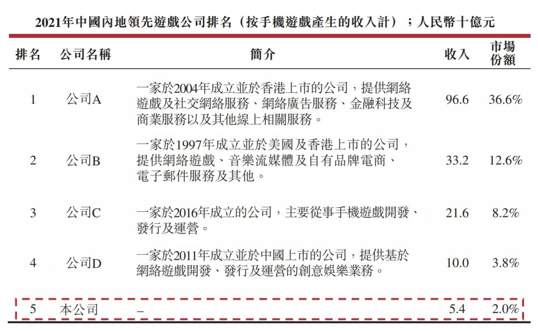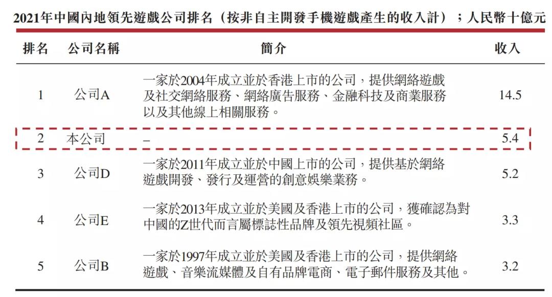 其实这个数据已经比两年前低了。其2022年11月公开的招股书中透露,2021年中旭未来的收入和市场份额是仅次于腾讯、网易、公司C、三七互娱的,市场份额达到2%;而在非自研移动游戏产品的收入上,中旭未来也仅次于腾讯的145亿元,以54亿元位居第二,领先于三七互娱、B站以及网易。
