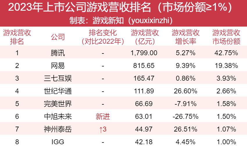 注:游戏公司的营收包含了出海业务,这里所说的市场总份额为:厂商收入/(国内游戏市场实际收入+中国自研游戏海外市场实际收入)/*100%。2023年国内游戏市场实际收入和中国自研游戏海外收入合计为4207.99亿元,数据来源于游戏工委
