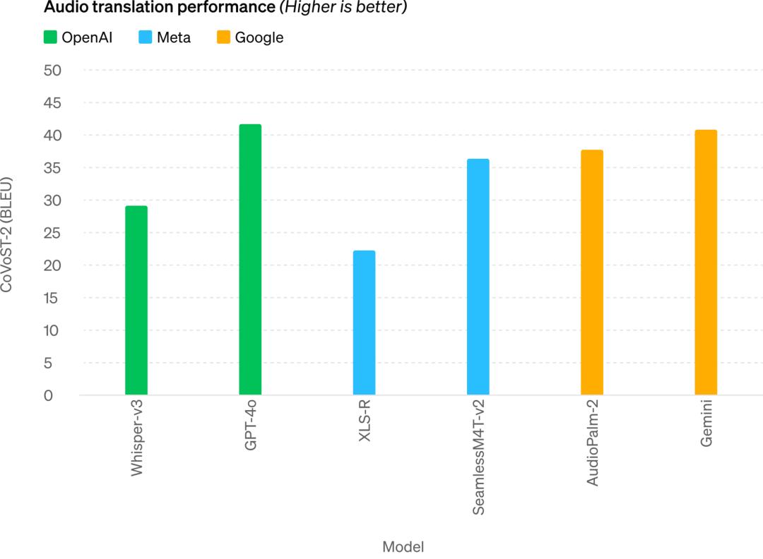 GPT-4o 在语音翻译方面取得了新的 SOTA 水平,并且在 MLS 基准测试中优于 Whisper-v3。