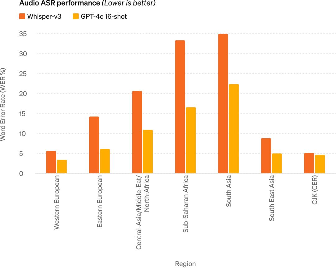 音频 ASR 性能:GPT-4o 相比 Whisper-v3 显著提高了所有语言的语音识别性能,特别是对于资源匮乏的语言。