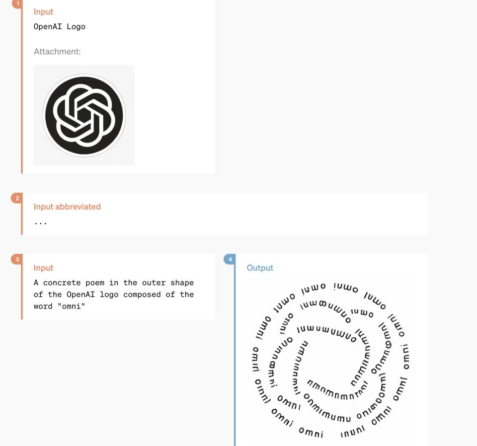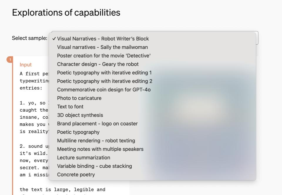 这一小部分也已经非常惊人了。除了在直播中重点强调的功能,在OpenAI的技术文档中,我们看到在GPT4-o的能力列表中,还包含3D能力、图像诗能力、转换卡通照片等能力。