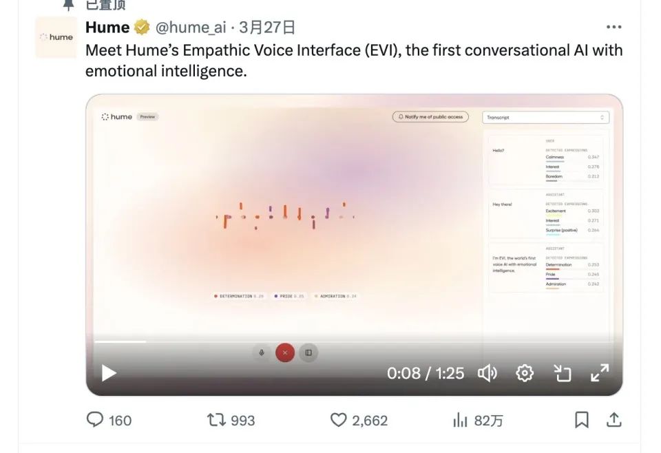 这些性能不由让人想起在3月27日,Hume AI刚刚的发布第一个能识别人类感情的AI——Evi,它能通过人类的声音语调判断出63种情感的综合。这在当时引发了业界的相当震动。