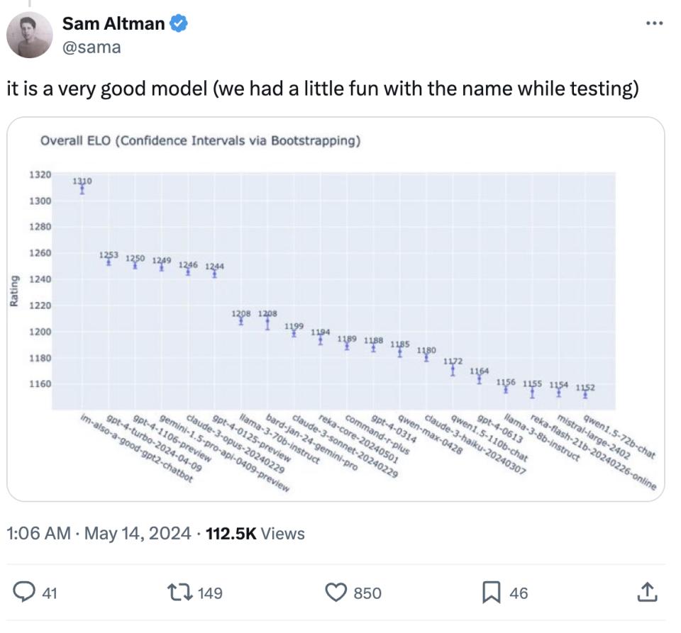 3、Sam Altman上线”承认“,GPT-4o就是前两天放出来的I'm a good gpt2 chatbot