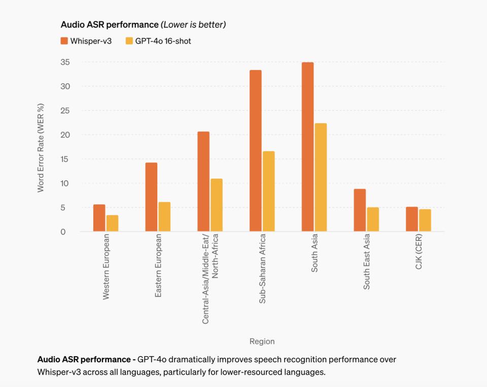 与Whisper-v3相比,GPT-4o在多种语言的识别表现优异,尤其是小语种语言