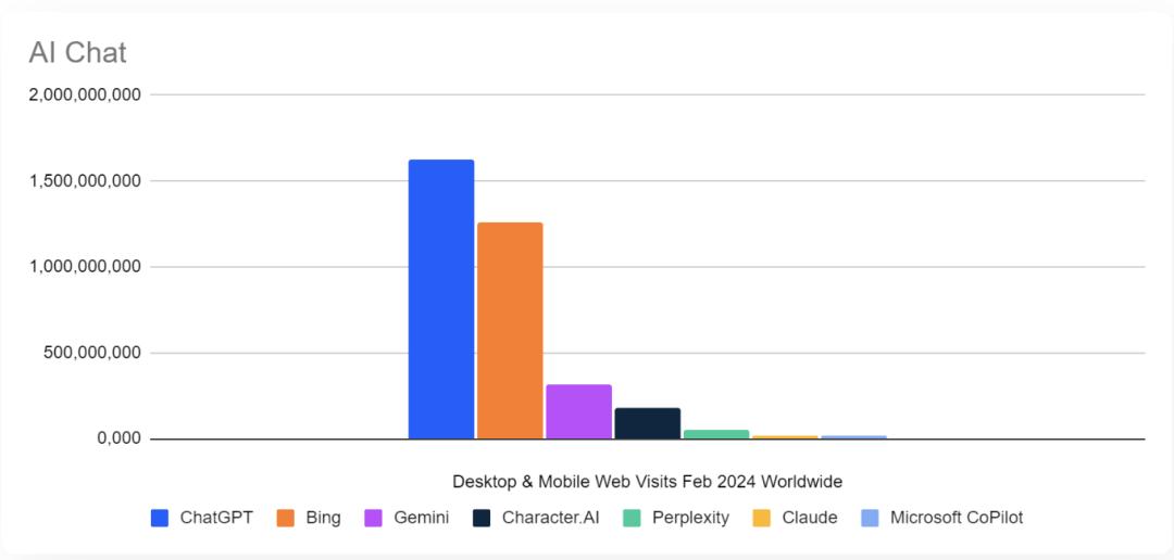 ChatGPT 和其他聊天机器人的访问量对比|图片来源:Similarweb