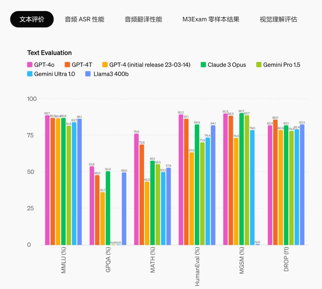 GPT-4o 在文本上的成绩相当优异|图片来源:OpenAI