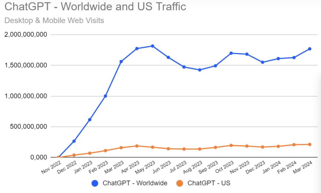 自 2022 年 11 月以来,ChatGPT 在全球和美国的流量增长情况|图片来源:Similarweb