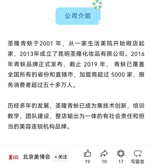 青眼号外进一步调查发现,昆明圣隆化妆品有限公司旗下拥有美容品牌青蚨。根据公开信息,圣隆青蚨于2001年从美容院起家,后成立了昆明圣隆化妆品有限公司。2016年正式发布青蚨品牌,截止到2019年,青蚨已覆盖全国所有的省份和直辖市,加盟商超过5000 家,服务消费者超过五十多万人。