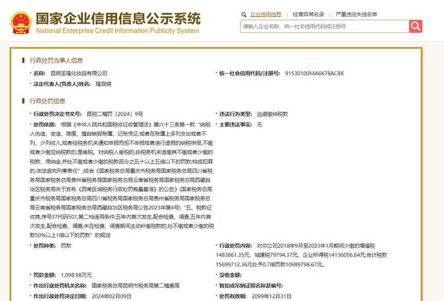 近日,青眼号外获悉,昆明圣隆化妆品有限公司(下称:昆明圣隆)因逃避缴纳税款,被国家税务总局昆明市税务局第二稽查局处罚1098.98万元。值得注意的是,这不仅是今年以来首个因税务问题被罚千万的企业,也是今年来化妆品行业首个千万级罚单。
