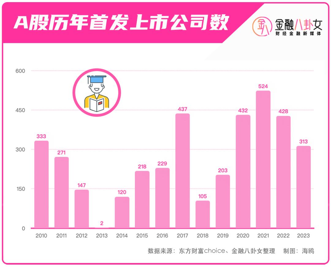 但IPO收紧的情况,也不是第一次出现了。就在2013年,全年上市新股总共才2只,第二年才慢慢恢复,但是后面的上市数量,也出现了两次新高,分别是2017年的437家和2021年的524家: