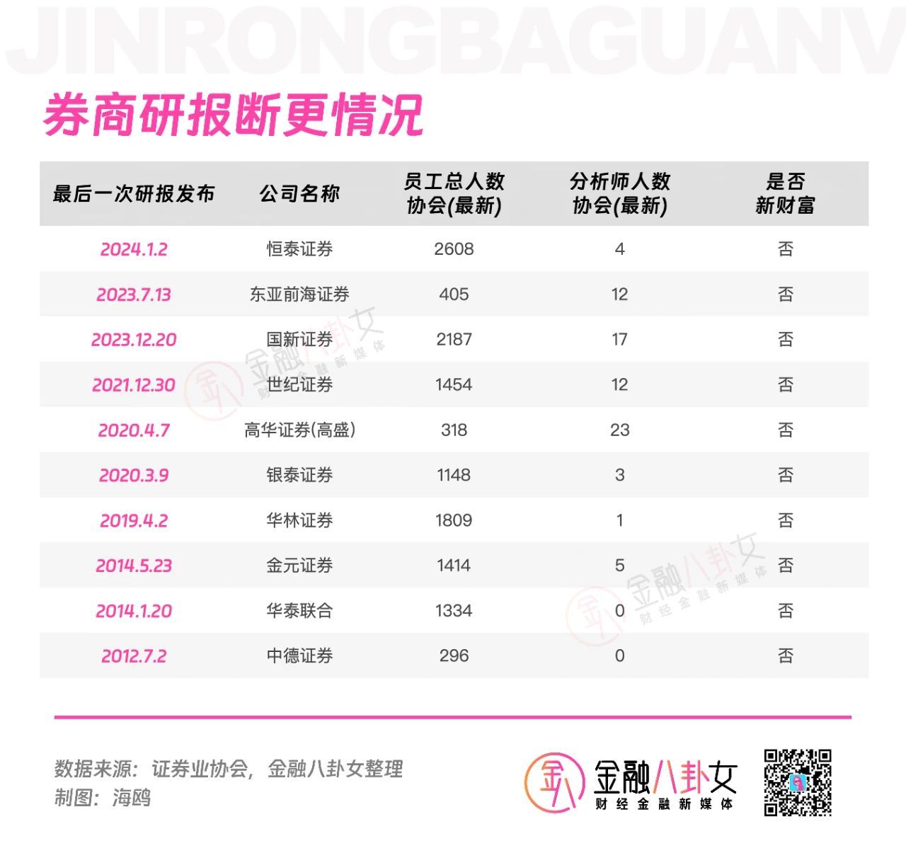 而去年开始报告“断更”的研究所,只有两家,分别是国新证券和中外合资的东亚前海证券,今年出现断更的只有恒泰证券。