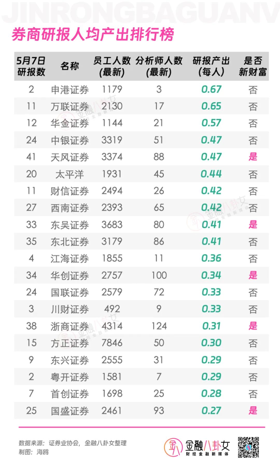 但是,如果把协会登记注册的分析师人数一并考虑进去,那最卷的前五名,应该是申港证券、万联证券、华金证券、中银证券和天风证券。