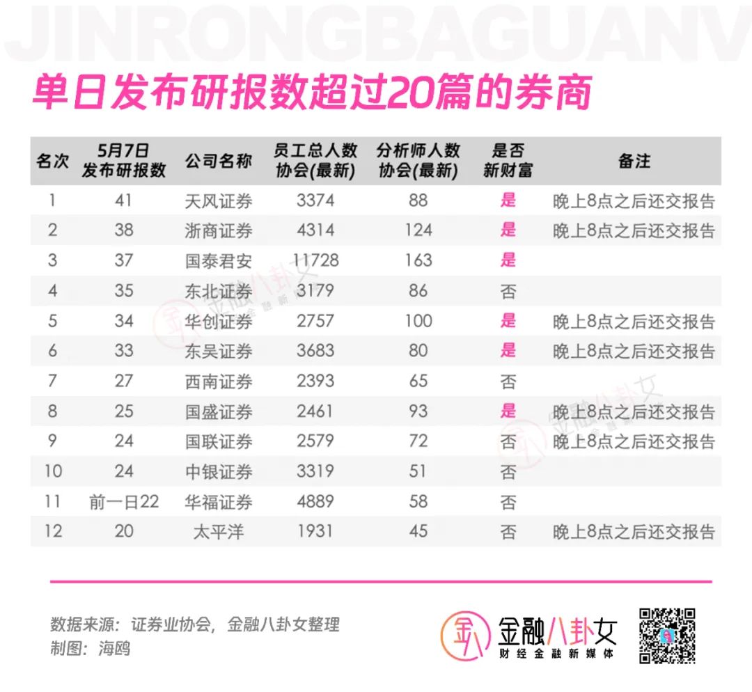 一共有七家券商研究所在晚上八点之后还提交报告,这七家全部都在“当日研报发布数量超过20篇”的榜单中。