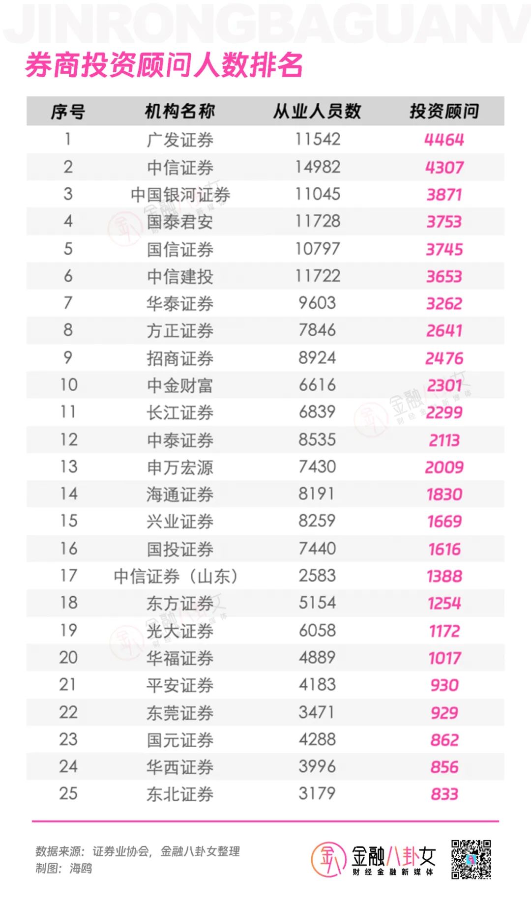 当然了国君的投顾人数还不是最高的人,只能排到第四名,广发才是第一,总共一万一千多人,投顾就占了四成多: