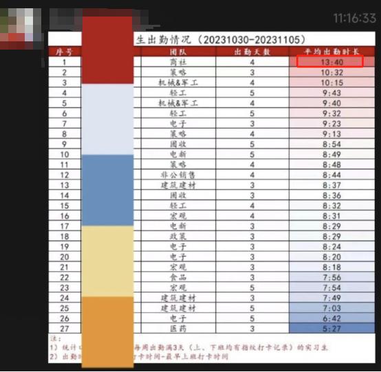 这事儿出了没一个月,又传出另一家券商的美女研究所所长,也在PUA实习生,直接晒他们的出勤时间,有几个实习生工作时长在8小时以下,干5个多小时的被直接取消实习资格,其他人建议单独沟通,不能提高的全部劝退。
