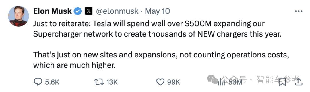 后来又在5月10日再次重申,并透露了更具体的计划,表示今年特斯拉会拿出5亿美元(折合人民币约为36.2亿元)扩展超充网络。