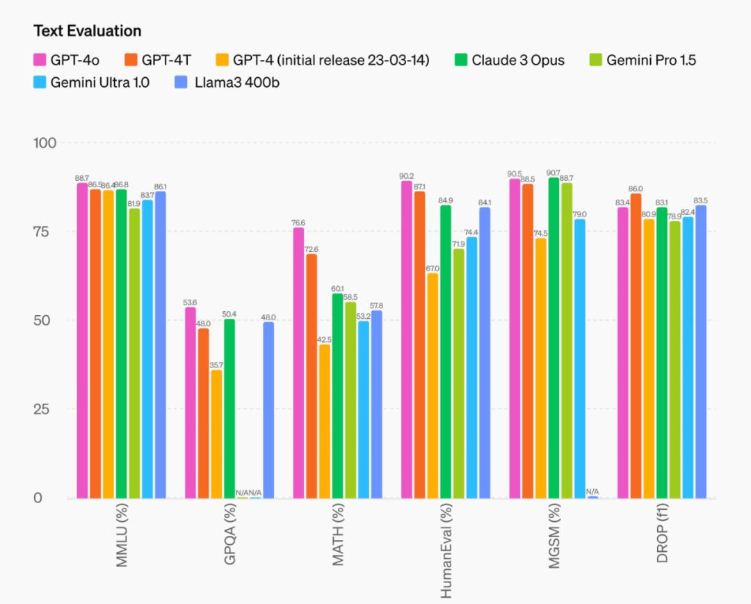 从性能来看,OpenAI表示,在传统基准测试中,GPT-4o在文本、推理和代码智能方面达到了GPT-4 Turbo级的性能,同时在多语言、音频和视觉能力方面达到了新高度。它在英文文本和代码上的性能与GPT-4 Turbo相当,在非英文文本上有显著改善。