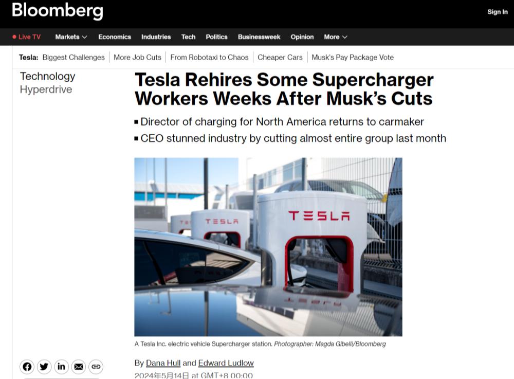 ▲彭博社报道特斯拉重新聘请已辞退人员
