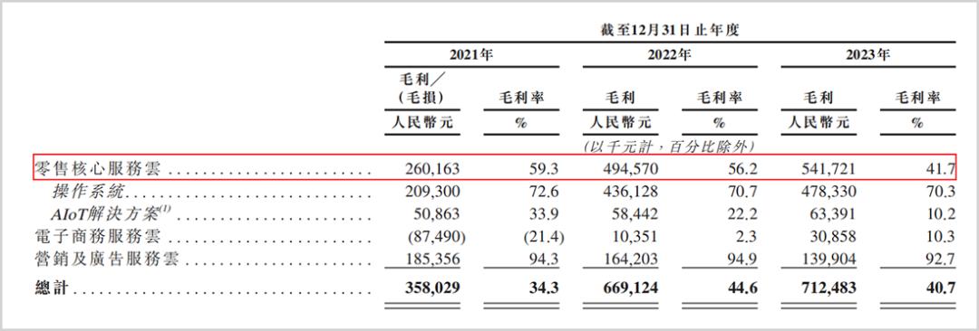 报告期内公司零售核心服务业务增长较快,由2021年的4.39亿增长至2023年的12.99亿,营收占比由42%提升至74.3%,但业务毛利率却由59.3%降至41.7%。
