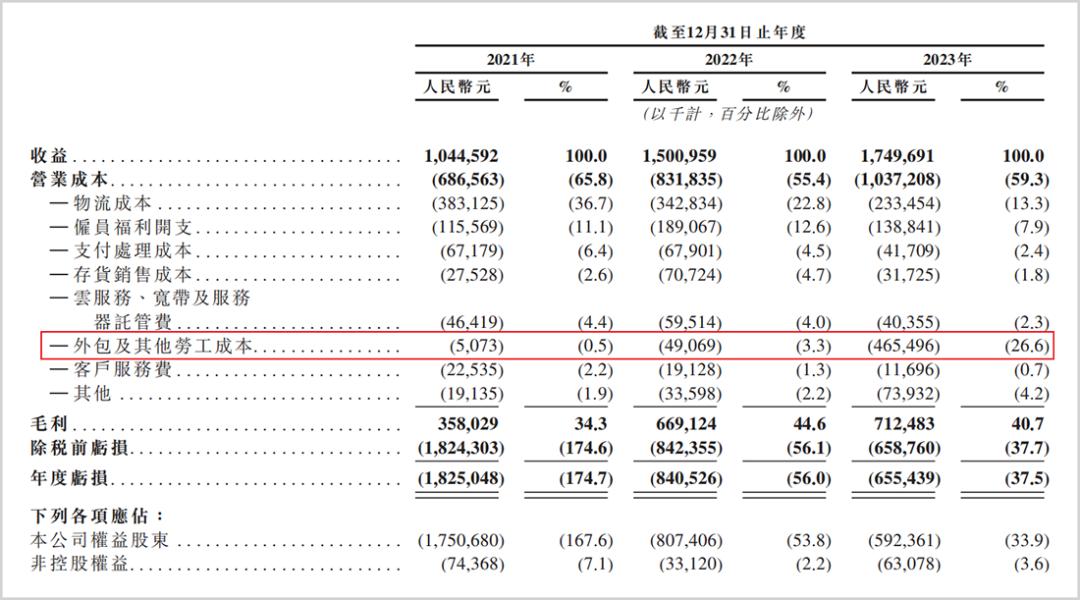 公司的持续亏损,主要在于营业成本增长较快。同期由6.87亿增长到了10.37亿,2年时间中增长了51%。拆分来看,营业成本中外包劳工的成本增长迅猛,由507.3万快速增长到了4.65亿。