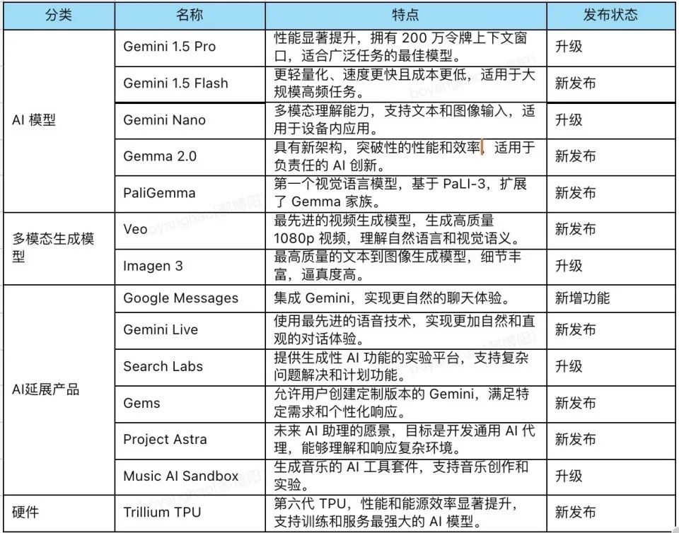 因为产品太多,我们把他们做了个简单表格整合,连带发布和新升级的AI相关产品足足有14项:
