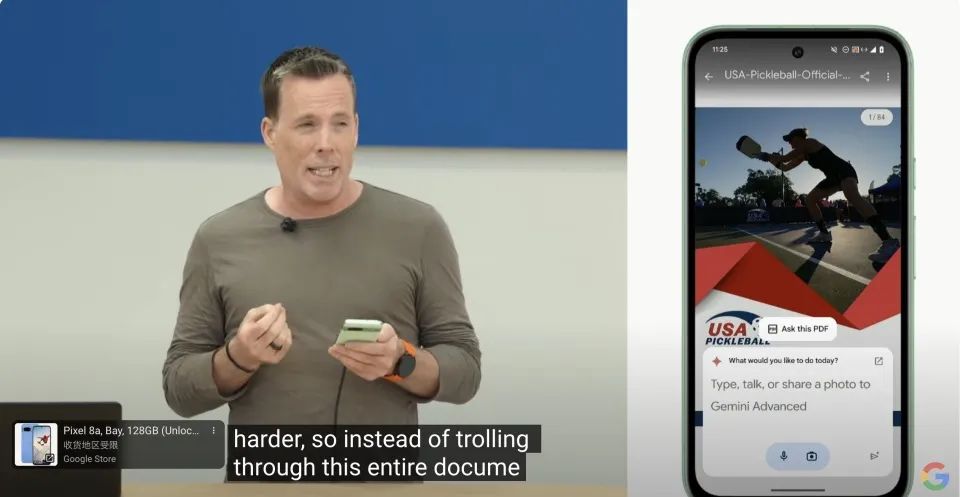 除了 Cricle in Search这个聚焦具体图片局部的多模态搜索外,本次Android AI重点是介绍了Gemini的手机应用,可以和手机上正在展示的内容进行互动。比如阅读打开的PDF,从你正在看的YouTube频道反馈问题。