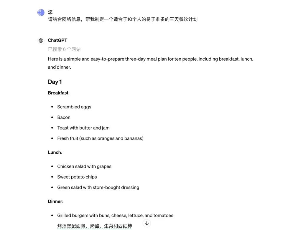 同样构建在多步推理能力之上的是AI搜索的计划能力。通过AI搜索中的计划功能,你可以直接在搜索里获得一个完整的计划。比如搜索类似“为一群人创建一个易于准备的三天餐饮计划”,您将获得一个起点,包含来自网络各处的各种食谱。这是其他搜索软件暂时还没有专精的能力。但是对于可联网的ChatGPT来说,这应该不是难事。当然谷歌搜索组织的更漂亮,还可以直接连接,用户体验更优。