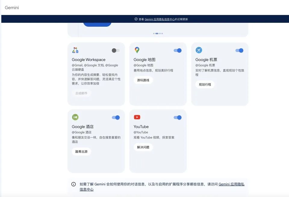 去年上线的API扩展功能将再次扩大,例如正在推出的 YouTube Music 扩展、Google Calendar、Tasks 和 Keep。全是谷歌自家的服务。说实话,在这次扩展之前,谷歌的插件库就这么五个插件,完全是少的可怜。就算加上这些新拓展,和其他Agent产品支持的API库也完全无法同日而语。