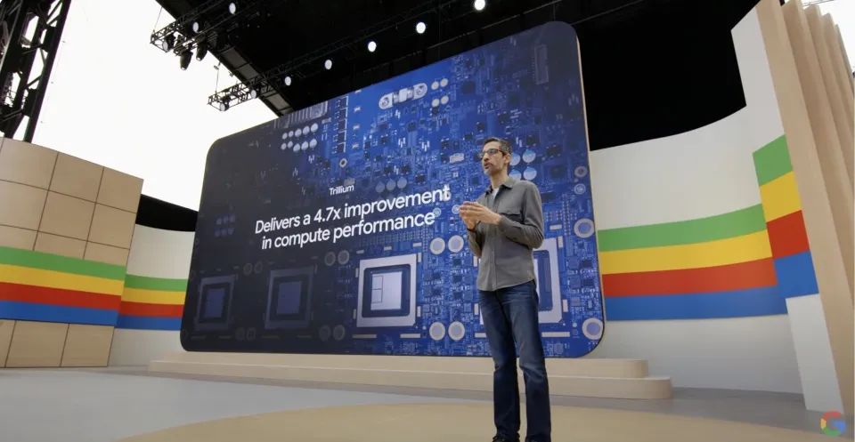 在这次发布会上,所有的AI模型都是由谷歌最新的TPU——Trillium TPU训练的。相较于前代,它的进步还是非常明显的。Trillium实现了每芯片峰值计算性能的 4.7 倍提升,比 TPU v5e 提高了一倍。高带宽内存(HBM)的容量和带宽和芯片间互连(ICI)的带宽也比v5e翻了一番。