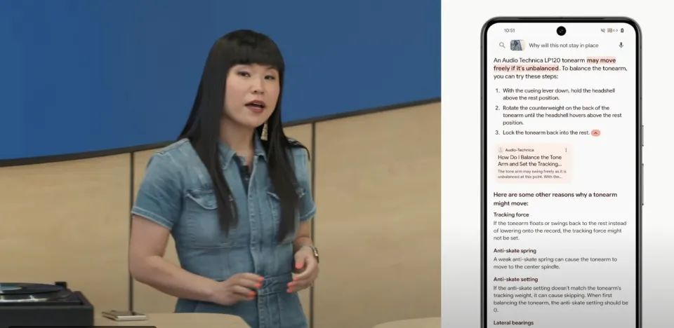 AI还能结合视频进行搜索。谷歌举了个范例,比如用户在旧货店买了一台唱片机,但打开时无法工作,带有针头的金属部件在意外漂移。用视频搜索能节省了用户找到合适词语来描述这个问题的时间和麻烦。