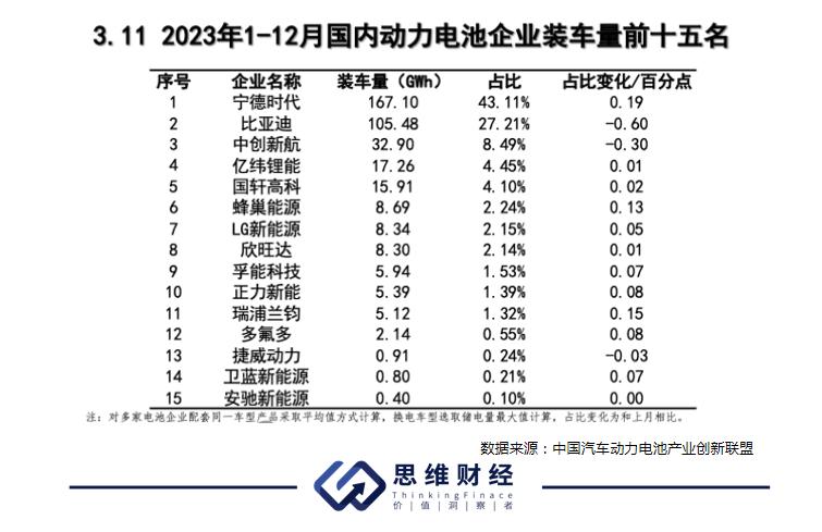 按厂商来看,2023年全年,宁德时代(300750.SZ)、比亚迪(002594.SZ)、中创新航(3931.HK)、亿纬锂能(300014.SZ)、国轩高科(002074.SZ)、依次是国内前五名,蜂巢能源、LG 新能源、欣旺达(300207.SZ)、孚能科技(688567.SH)、正力新能紧随其后。