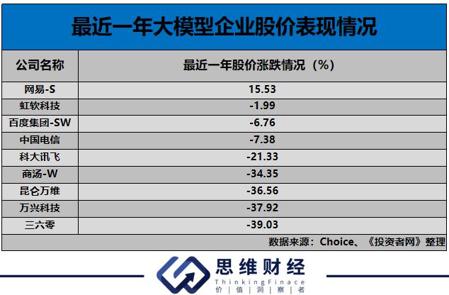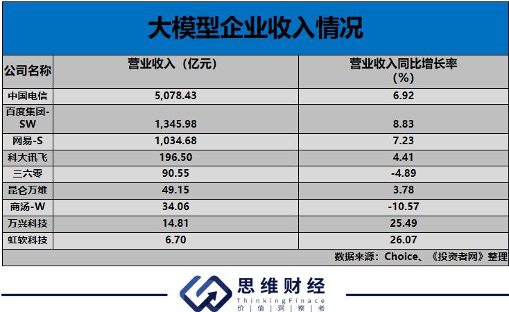相较于通用大模型落地难的问题,专业大模型的商用进程则快很多。百度2023年就依靠AI技术在广告领域的应用,扭转了公司收入下滑的趋势,当年公司的收入同比有了8.83%增长;网易(09999.HK)也依靠AI技术在游戏上的应用,让2023年公司的收入首次突破了千亿;视频AI工具开发商万兴科技,2023年公司的收入更是有了25.49%的上涨。