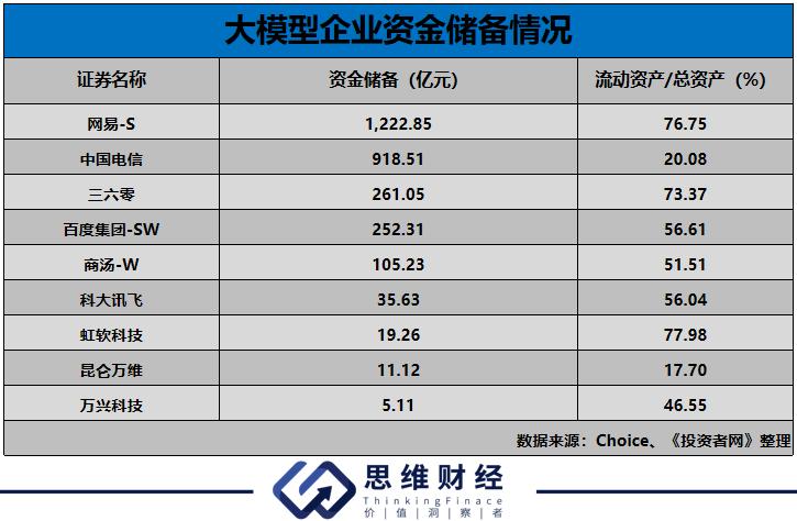AI技术需要大量资金投入,因此资金储备将是评估一家AI公司发展前景的重要指标。在目前有大模型开发规划的企业中,网易的货币资金储备最高,2023年末公司现金及现金等价物账面余额高达1222.85亿元,其流动资产在当期公司总资产中的占比也有76.75%。虽然公司还未盈利,但商汤也储备了105.23亿元的资金。