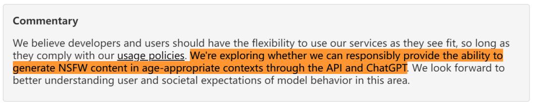 据美国《连线》杂志报道,OpenAI 于上周三发布的一项文档草案显示,他们正在探索如何让OpenAI 的 API 和 ChatGPT“负责任”地生成露骨内容。虽然目前尚不清楚以上表述是否直接意味着 OpenAI 的使用政策即将放宽,但指向意义相当明确,OpenAI 显然已经注意到了 AI 在成人内容领域的旺盛需求,并它也已经在思考该如何“优雅地”进入。