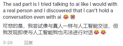 一个海外用户的评价可能很好说明了一部分用户遇到的情况,不擅长和真人交流的用户,同样也不擅长和 AI 交流,可能聊 10 分钟就无话可说了,难以建立情感连接。
