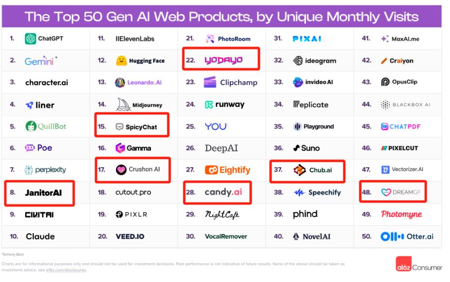 涉及NSFW内容的AI情感陪伴产品用 红框标出 | 图源:a16z AI产品Top50榜单