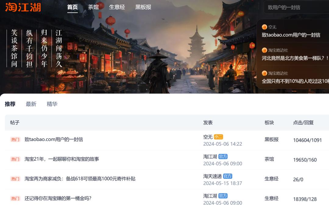 甚至尘封十余载的淘江湖论坛也在淘宝网页端复活,被放在了网页端的显眼位置,还从后台恢复了马云二十年前署名“风清扬”发布的帖子。