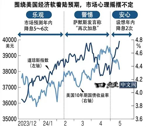 全球的投资资金以同时实现缓解通货膨胀和避免美国经济衰退的“软着陆”预期为前提,再次开始行动。这在很大程度上是因为美国的经济指标接连下行,美国推迟降息的预期和再次加息论有所减弱。市场摆脱了警惕模式,美国道琼斯工业平均指数5月16日在盘中首次冲上4万点大关。