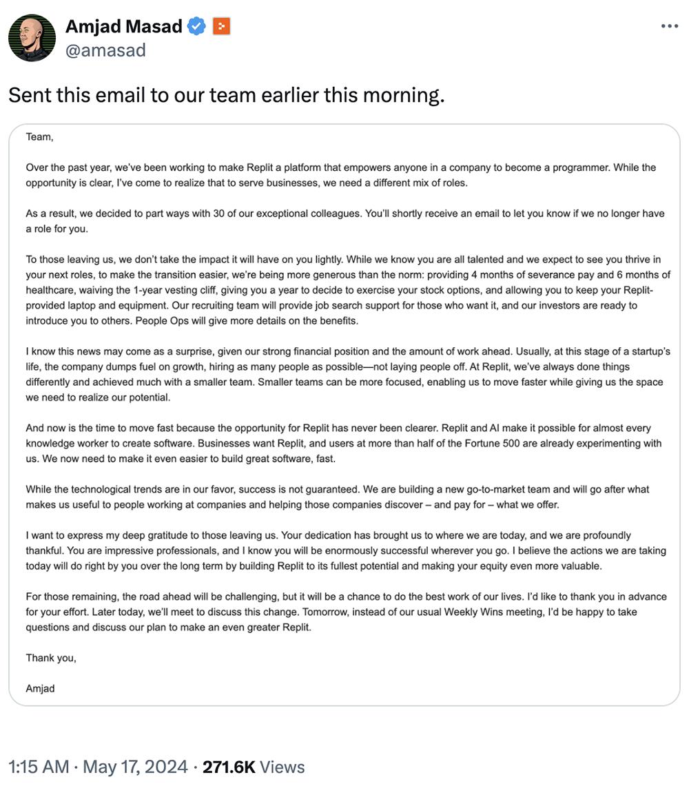 北京时间今日凌晨,美国AI编程创企Replit的CEO Amjad Masad在社交平台X上发布一封电子邮件,宣布公司已裁员30人,约占其员工总数的20%。